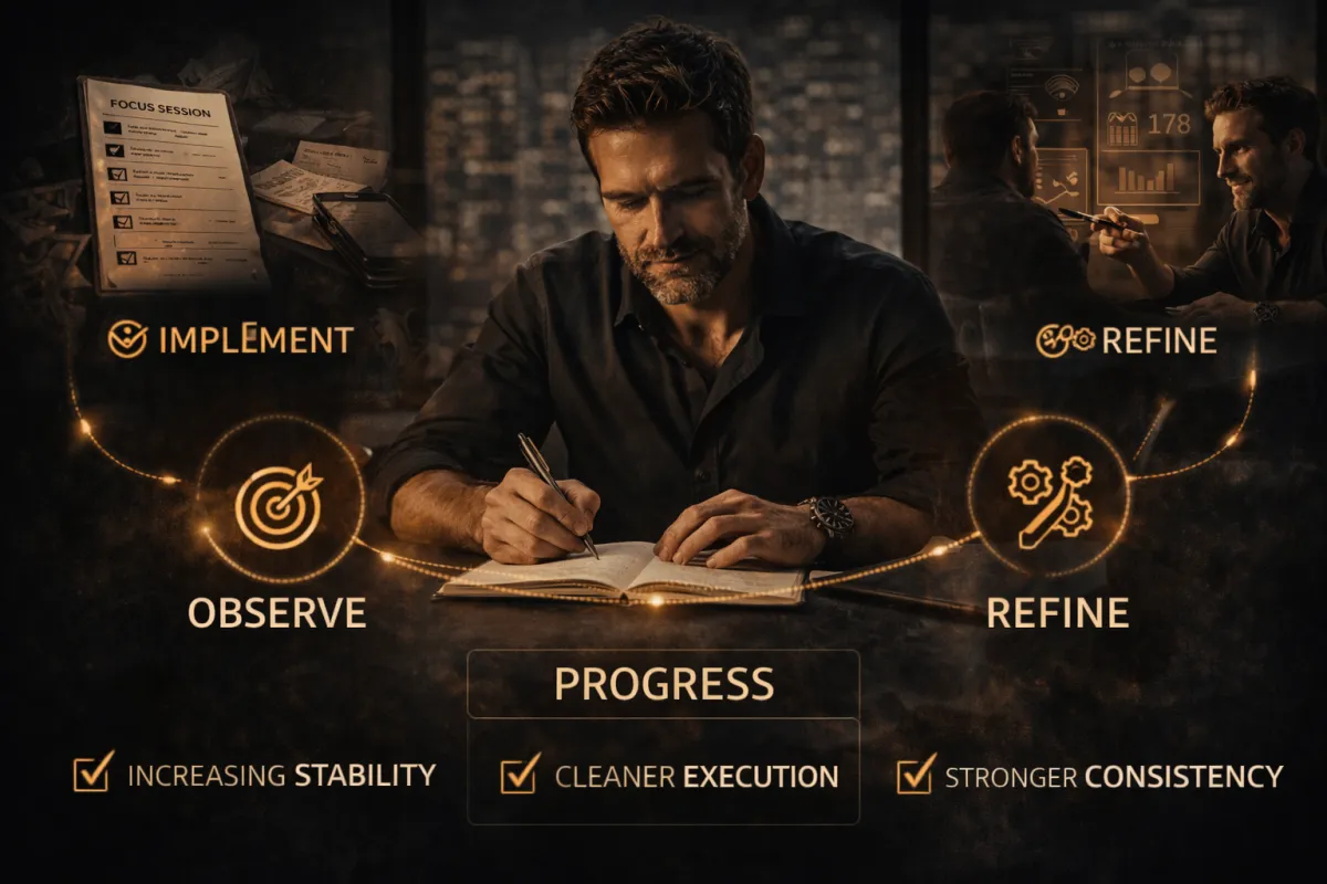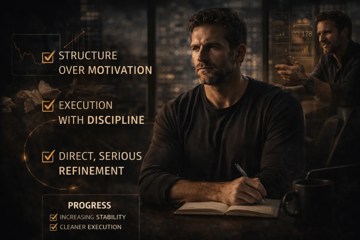 Each week is built around a defined point of focus. You implement between sessions, observe what actually happens, and return with real material to refine. Progress is not measured by emotional intensity or temporary momentum, but by increasing stability, cleaner execution, and stronger internal consistency over time.